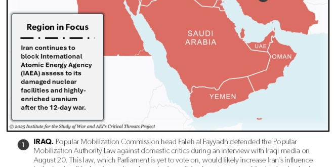 • Justifications for the PMF: Iraqi Popular Mobilization Commission head Faleh al Fayyadh defended the Popular Mobilization Authority Law against domestic critics during an interview with Iraqi media on August 20. This law, which Parliament has yet to vote on, would likely increase Iran’s influence in the Iraqi political and security spheres by formalizing key structures of the Iranian-backed Popular Mobilization Forces (PMF) within the Iraqi security apparatus.