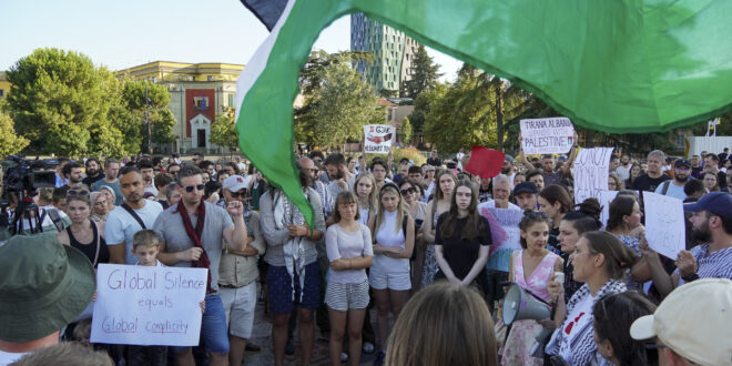 As global outrage toward the state of Israel grows over the escalating humanitarian crisis and atrocities against Palestinians, several hundred citizens gathered last night in Skënderbeg Square in Tirana to express solidarity with the Palestinian people and to demand an end to the genocide in Gaza.