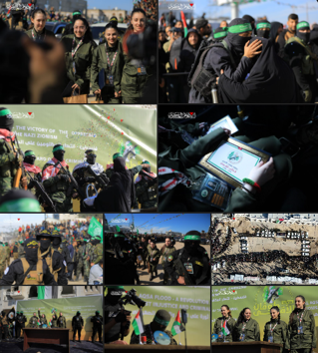 Hostage handovers have been carefully staged to demonstrate organisational resilience despite heavy losses from Israeli airstrikes and the killing of key leaders. During the January 25, 2025 handover of Karina Ariev, Daniella Gilboa, Naama Levy, and Liri Albag to the International Committee for the Red Cross (ICRC), AQB fighters appeared in large numbers, displaying pristine uniforms and weapons to suggest sustained capacity. The hostages were released smiling, wearing ID lanyards, and carrying certificates and gift bags. The framing of this handover attempted to portray Hamas as merciful, organised and with a sustained military capability.