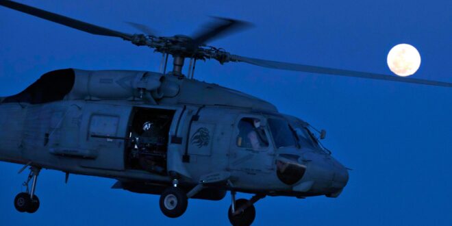 CFRC9F A US Navy Sea Hawk helicopter launches from the flight deck of the aircraft carrier USS Carl Vinson in the light of a full moon February 7, 2012 in the Arabian Sea.