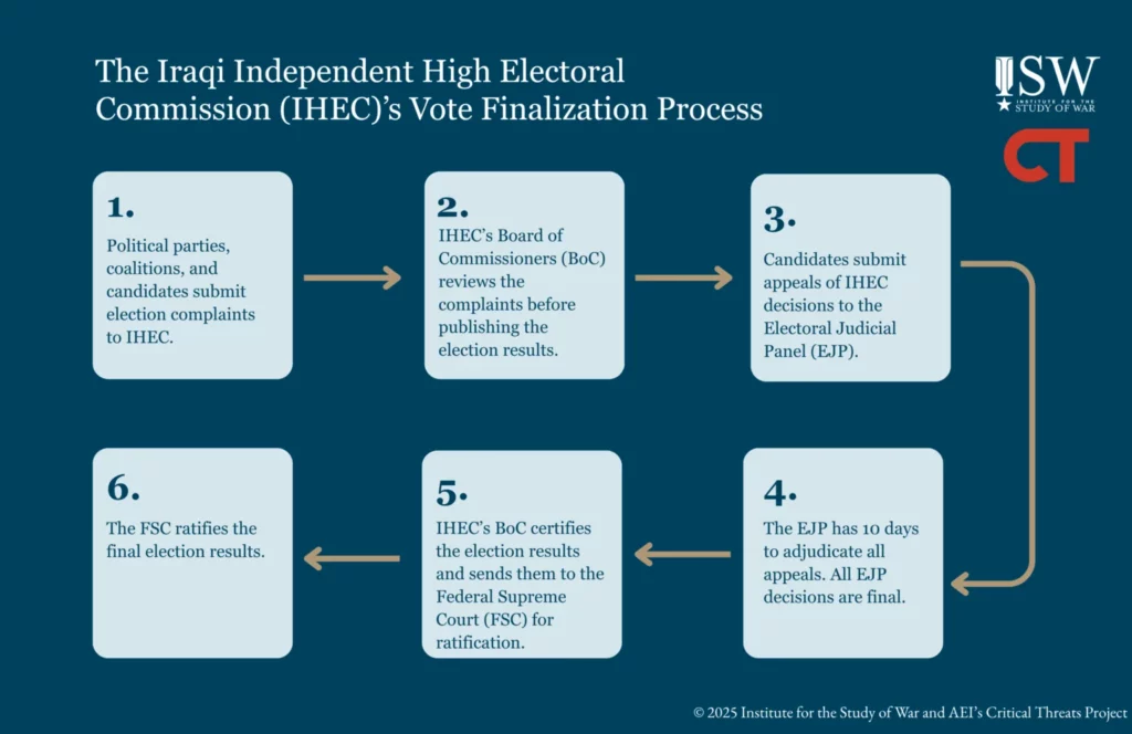 These discussions have continued even though the Independent High Electoral Commission (IHEC) has not finalized the election results or released the preliminary election results yet.[28] IHEC must first review all election complaints that political parties, coalitions, and candidates submitted before publishing the parliamentary election results.[29] IHEC reported on November 13 that parties, coalitions, and candidates have so far submitted 101 election complaints.[30] Political parties, coalitions, and candidates can then appeal both IHEC’s decisions on complaints and the final electoral results to the Electoral Judicial Panel.[31] IHEC will then certify all election results and send them to the Federal Supreme Court for ratification, following any additional adjudication by the Electoral Judicial Panel.[32] The Federal Supreme Court’s ratification of the results is the first step in government formation.[33] CTP-ISW will provide additional analysis about Iraq’s official election results in future Iran Updates.