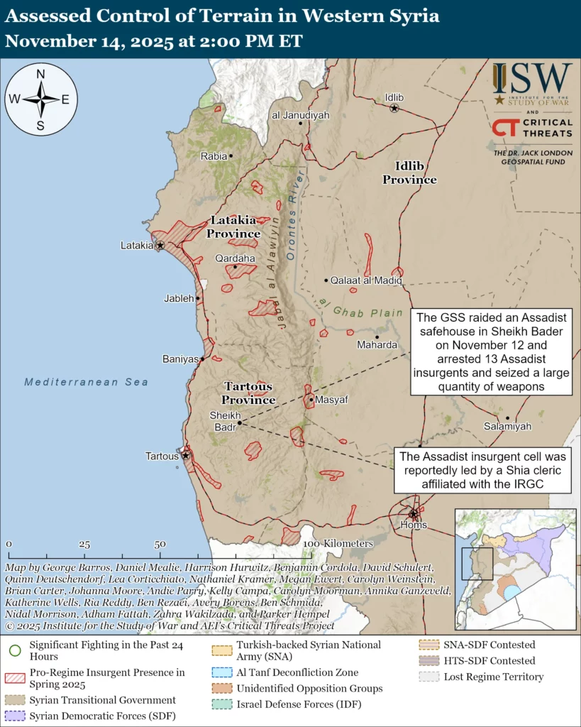 Unknown actors are attempting to develop a covert pro-Assad insurgent and support networks in coastal Syria. The Syrian General Security Service (GSS) dismantled a large, well-equipped Assadist insurgent cell in Sheikh Bader, Tartous Province, on November 12.[34] GSS forces raided an Assadist safehouse in Sheikh Bader, where they arrested 13 Assadist insurgents and seized a large quantity of weapons and ammunition, including RPGs, marksman rifles, and machine guns.[35] The Assadist safehouse also contained a small field clinic, communication devices, and an additional weapon cache hidden in a nearby cave.[36] The Ministry of Interior (MoI) said that the Assadist cell was led by a Shia cleric from Idlib Province who had coordinated with Iran and the IRGC to organize pro-Iran religious events in Aleppo City from 2018-2024.[37] The MoI claimed that the Assadist cell killed 20 civilians in various attacks and attempted to recruit young men and children into the group.[38] Covert activities are activities that a sponsor or group executes to conceal their identity or involvement, but the activities themselves–in this case, killings–are usually visible. The group did not claim these killings or activities.
