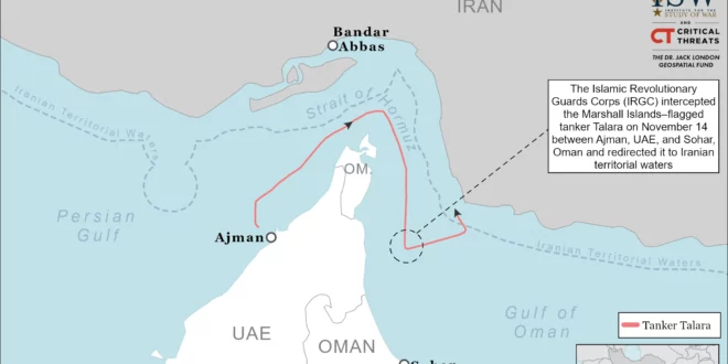 Three small Islamic Revolutionary Guards Corps (IRGC) vessels intercepted a Marshall Islands-flagged oil products tanker, Talara, and moved it into Iranian waters in the Strait of Hormuz on November 14.[1] The vessel is operated by Cyprus-based, German- and British-owned Columbia Ship Management. The vessel is owned by Pasha Finance, which allegedly has familial ties to Azerbaijani President Ilham Aliyev.[2] The vessel was headed to Singapore from the United Arab Emirates (UAE) and was carrying a cargo of high-sulfur gas oil.[3] Iranian naval forces intercepted the vessel on early Friday morning and diverted it into Iranian territorial waters.[4] Columbia Ship Management stated that it lost contact with the vessel around 0822 local time near the coast of Khor Fakkan, United Arab Emirates. The IRGC issued a statement on X on November 14, quoting a Quranic verse: “So whoever has assaulted you, then assault him in the same way that he has assaulted you,” suggesting that Iran is retaliating for a previous incident.[5]