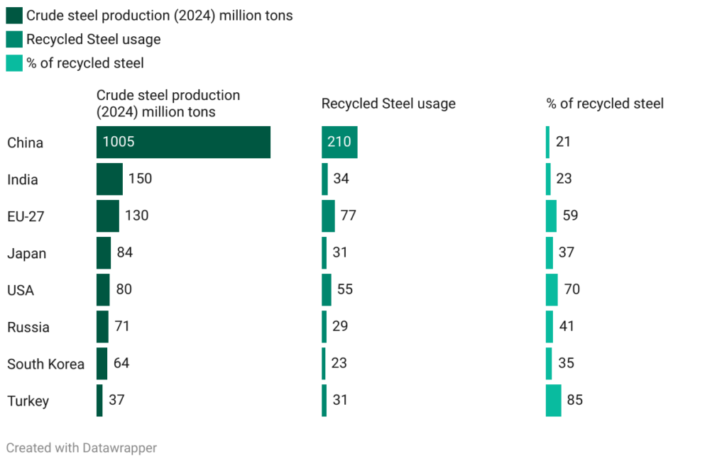 Turkey bet big on the steel recycling as it lacks the natural resources necessary to run iron ore-based steel production. Today, over 80% of Turkey’s steel comes from scrap. Among EU countries, in comparison, it doesn’t reach 60%.