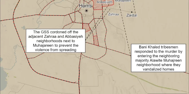 Unknown actors attempted to instigate sectarian conflict between Sunnis and Alawites in Homs City, but the responses of local security forces and residents contained the violence and prevented its spread or intensification. Unknown actors killed a Sunni Bedouin couple from the Bani Khaled tribe in their home in Zaidal, in the western outskirts of Homs City, on November 23.[46] A Syrian source reported that unknown actors wrote sectarian slogans in the victim’s blood on the walls of the house in an attempt to incite widespread sectarian conflict in Homs City.[47] One of the slogans was “Ya Hussein,” a Shia phrase that Alawites use.[48] Zaidal neighbors several of Homs City’s Alawite-majority neighborhoods. Members of the Bani Khaled tribe vandalized homes in the neighboring majority Alawite Muhajreen neighborhood in response to the murder, according to an independent Syria researcher in Homs City.[49] The General Security Service (GSS) cordoned off Muhajareen‘s adjacent neighborhoods of Zahraa and Abbasiyeh to prevent the violence from spreading.[50] Bani Khaled tribesmen later broke through the GSS cordon and attacked Alawite and Sunni homes in the mixed Bedouin-Alawite neighborhood of Abbasiyeh.[51] The independent researcher emphasized that the GSS tried to contain the situation and restore order in western Homs, but struggled due to insufficient resources to cordon off hundreds of streets.[52] The GSS reestablished control of Abbasiyeh after the Syrian Ministry of Defense (MoD) deployed fighters to the area and erected other barriers to prevent the violence from spreading.[53] Unaffiliated Bedouin tribesmen also helped the GSS restrain Bani Khaled tribesmen in Abbasiyeh, which shows that the tensions were not strictly Sunni–Alawite.[54] The GSS imposed a temporary curfew over Homs City.[55] The combined efforts by the GSS and local Bedouins were critical in preventing the spread of sectarian violence in the area, such as how the deployment of Syrian forces exacerbated violence along the Syrian coast on March 6.[56] The GSS isolated the sectarian unrest in Homs through containment measures, cross-communal cooperation, and rapid intervention, which reduced the violence and prevented it from escalating into mutual sectarian reprisals. The Homs Health Directorate reported that 18 people were injured in Homs City on November 23 but did not report any deaths.[57]