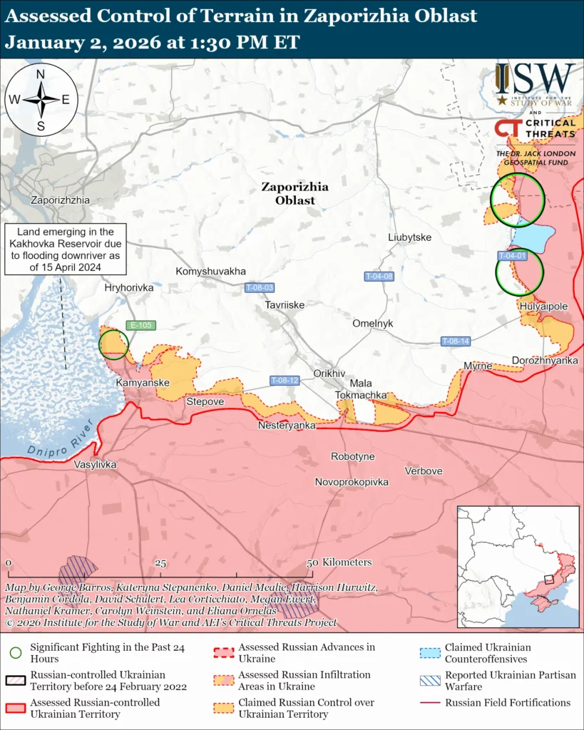 Russian forces attacked near Hulyaipole itself; north of Hulyaipole near Dobropillya and Zelene; northeast of Hulyaipole near Solodke, Rybne, Pryvillya, and Zlahoda; and west of Hulyaipole toward Zaliznychne on December 31 and January 1 to 2.[111]