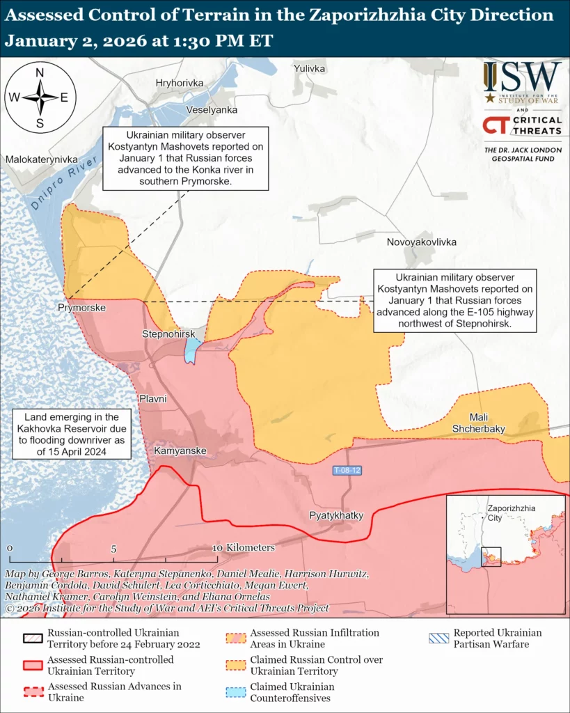 Assessed Russian advances: Ukrainian military observer Kostyantyn Mashovets and a source reportedly affiliated with Ukrainian military intelligence reported on December 31 and January 1 that Russian forces bypassed Stepnohirsk (west of Orikhiv) to the west along the road to Hryhorivka (north of Stepnohirsk) and to the east along the road to Lukyanivske (northeast of Stepnohirsk).[118] Mashovets reported that Russian forces reached the Ukrainian defensive line along the Konka River near Prymorske (west of Orikhiv).[119] Russian and Ukrainian sources indicated that Russian forces have not yet seized Stepnohirsk or Prymorske, however.[120]