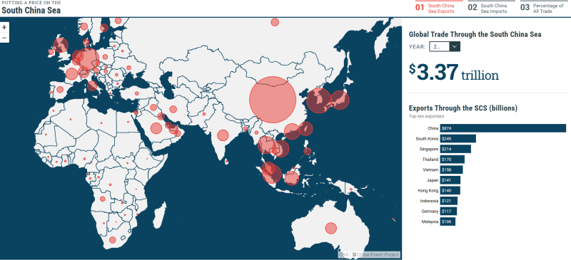 Vous pouvez voir ici l’importance des échanges commerciaux qui transitent par la mer de Chine méridionale.