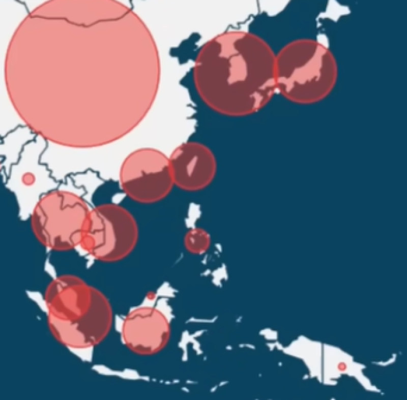 Ce gros point rouge montre que la plupart des navires qui passent par la mer de Chine méridionale vont et viennent de Chine. Et encore une fois, tous ces pays considèrent la Chine comme leur plus gros partenaire commercial pour les exportations et les importations. Tout leur commerce passe donc par la mer de Chine méridionale pour aller en Chine et revenir. C’est donc surtout le trafic maritime chinois qui traverse la mer de Chine méridionale.