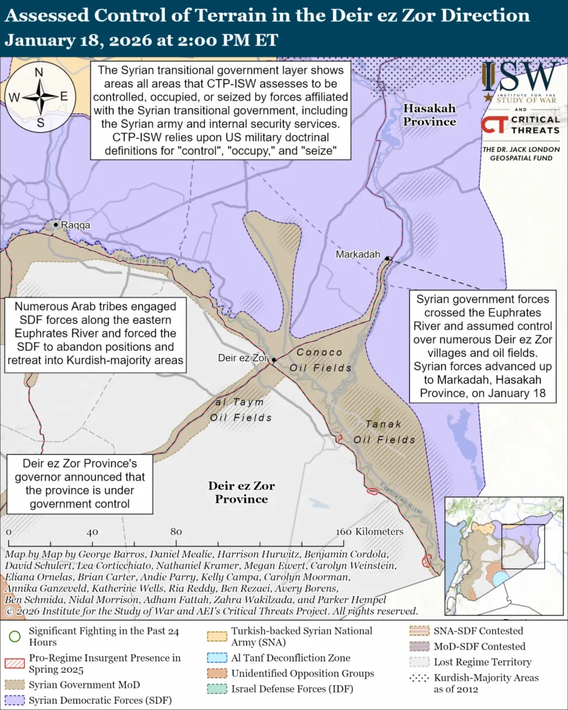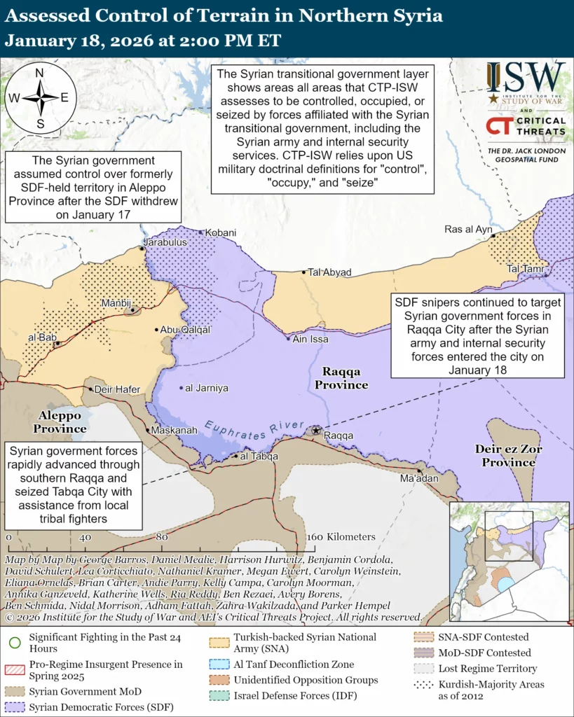 The ceasefire that Syrian Democratic Forces (SDF) Commander Mazloum Abdi and Syrian President Ahmed al Shara signed on January 18 outlines broad SDF concessions on several of the issues that the SDF has attempted to demand over the past year. The Syrian government seized large swaths of SDF-held territory in Raqqa and Deir ez Zor provinces in a rapid offensive on January 17 and 18.[25] The government advanced through the southern Raqqa countryside, seizing the SDF-held city of Tabqa, SDF-held oil fields in the Raqqa desert, and SDF-held towns in Raqqa along the southern bank of the Euphrates River before advancing into Raqqa City.[26] Government forces simultaneously advanced across the Euphrates River in Deir ez Zor Province and assumed control of SDF-held villages and oil fields.[27] The sudden loss of territory forced the SDF to capitulate to long-held government demands in a ceasefire agreement that Syrian President Ahmed al Shara and SDF commander Mazloum Abdi signed on January 18.[28]