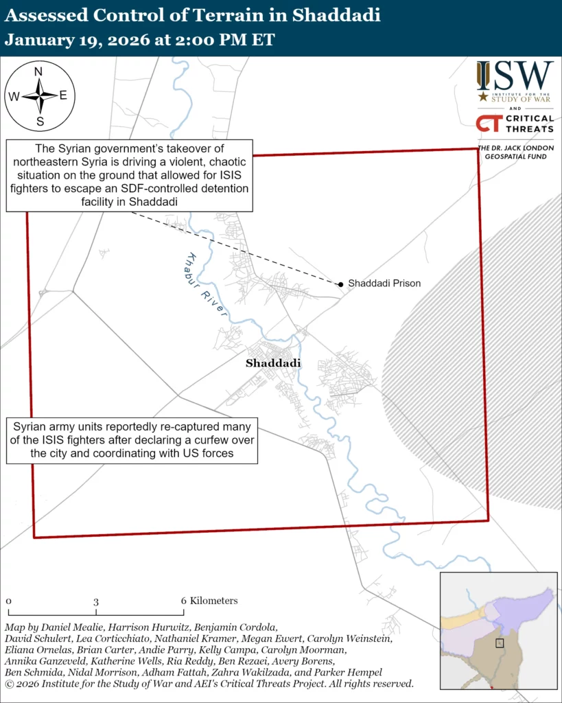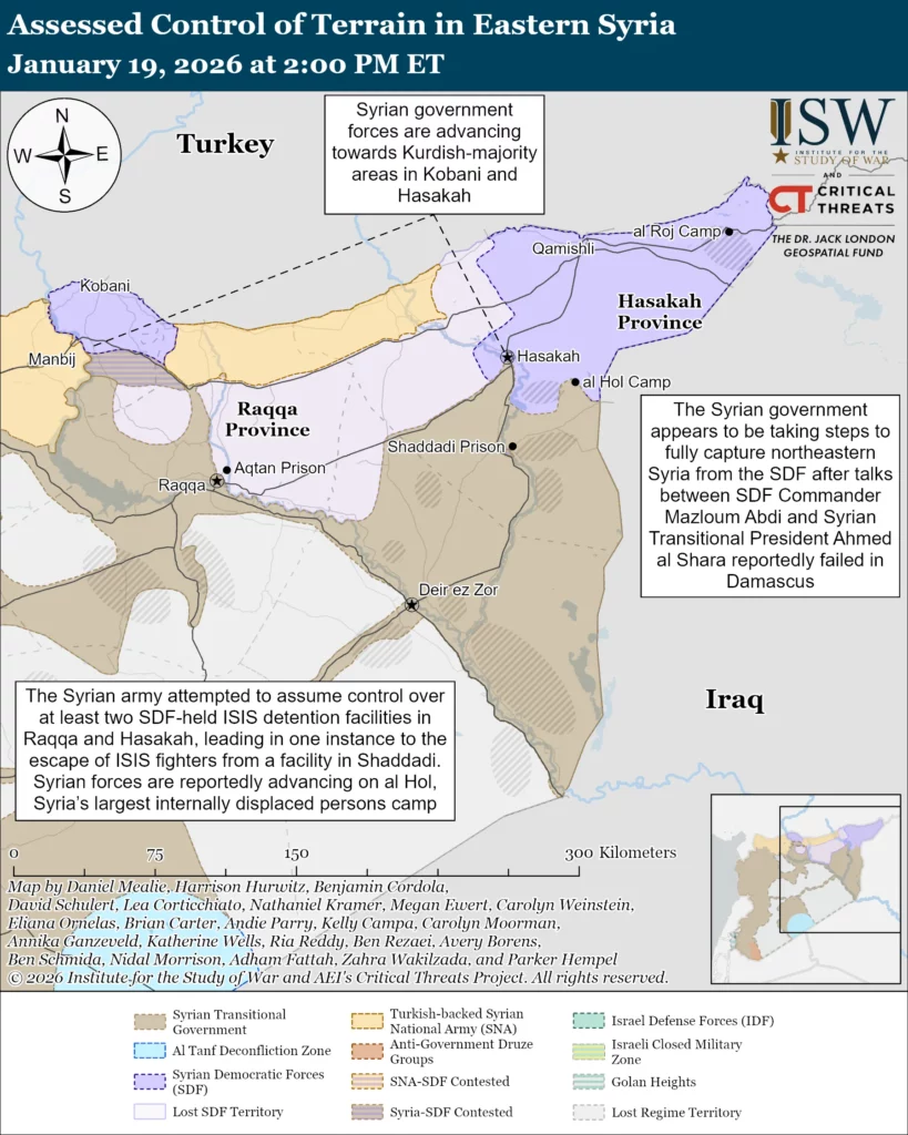 The United States’ framework for sustaining success against the Islamic State in Iraq and al Sham (ISIS) in northeastern Syria is collapsing. The Syrian government appears to be taking steps to fully take over northeastern Syria from the SDF after talks between SDF Commander Mazloum Abdi and Syrian Transitional President Ahmed al Shara in Damascus on January 19 reportedly failed.[1] Abdi and Shara met to presumably discuss and finalize the ceasefire agreement that they both signed on January 18 that outlined broad SDF concessions to Shara and his Damascus-based government.[2] Shara demanded during the January 19 meeting that the SDF hand over “the autonomous region” to the government, according to an SDF source.[3] Abdi left Damascus without any announcement or agreement.[4] Government forces—which have secured much of formerly SDF-controlled territory in northeastern Syria as of January 19—are advancing towards both of the remaining SDF-held regions of Syria: the Kurdish-majority areas around Kobani, northern Aleppo Province, to the west, and Hasakah City, Hasakah Province, to the east.[5] The SDF called upon Kurds in and outside of Syria to join the SDF to fight ”the Turkish state and its ISIS-minded gangs” shortly after Abdi returned to Hasakah.[6] The Syrian government contains many Islamist militia factions and some Salafi-jihadi groups, but it does not include organized ISIS fighters. Kurdish fighters are reportedly preparing to confront government forces in Kobani and Hasakah City, according to local media.[7]