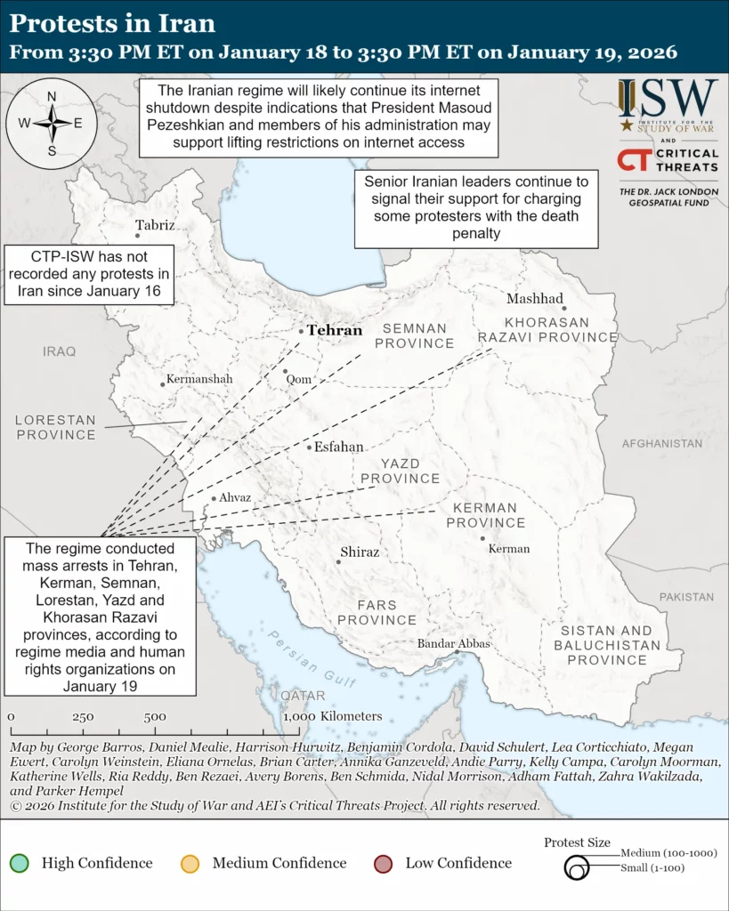 The regime will likely continue its internet shutdown despite indications that Pezeshkian and members of his administration may support lifting restrictions on the internet. Pezeshkian advised Supreme National Security Council Secretary Ali Larijani on January 18 to lift internet and communications restrictions to facilitate online business.[32] Science, Technology, and Knowledge-Based Economy Vice President Hossein Afshin stated on January 19 that internet access is expected to be restored ”today, tomorrow, or by the end of the week.”[33] Afshin added that authorities may grant fixed IP access to large companies if disruptions continue, but emphasized that this would not entirely address the challenges facing the digital economy.[34] The Pezeshkian administration may seek to restore internet access because it recognizes the economic toll that sustaining the internet shutdown has on the Iranian economy. Internet monitor NetBlocks estimates that country-wide internet shutdowns cost over $1.5 million USD per hour.[35] The shutdown, however, enables the regime to hide the extent of its brutal protest crackdown from its people and the international community. The regime has signaled that it continues to believe that the threat it faced from this protest wave has not passed and, therefore, may be reticent to significantly ease internet restrictions in the near future if it continues to fear renewed large-scale protests.