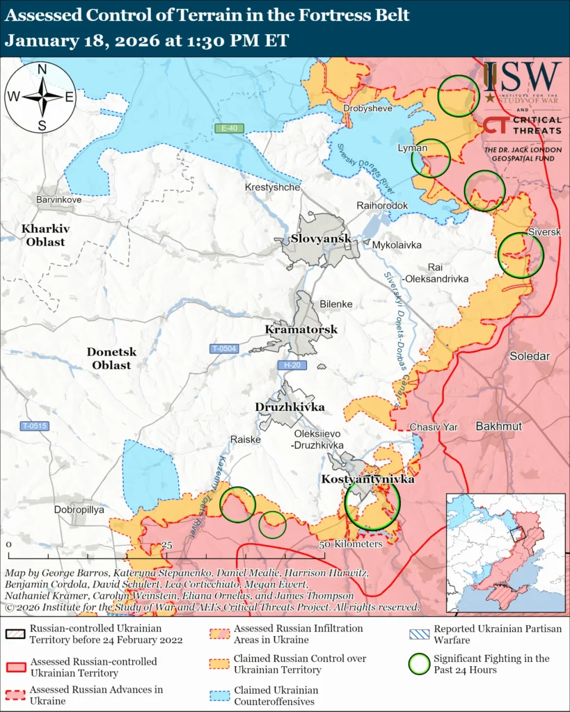 The commander of a Ukrainian drone battalion operating in the Kostyantynivka direction reported on January 17 that Russian forces are conducting motorized assaults to bypass Kostyantynivka and cut off Ukrainian logistics into the town.[40] The commander stated that Russian forces are also attempting to infiltrate into Kostyantynivka itself on motorcycles. The commander stated that Russian forces in the Kostyantynivka direction are interdicting Ukrainian logistics with fiber-optic drones and radio-controlled first-person view (FPV) drones.