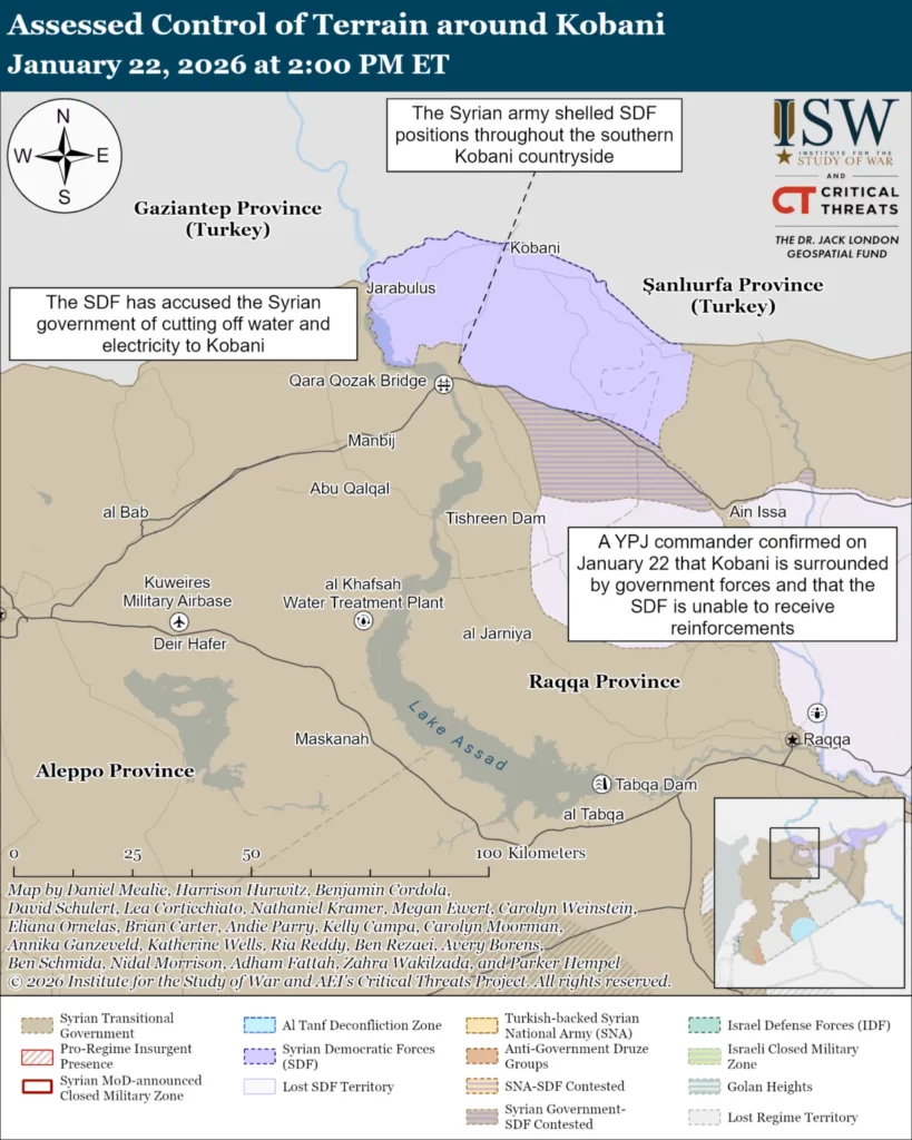The Syrian government surrounded Syrian Democratic Forces (SDF) fighters in Kobani, likely as the first part of a multi-stage operation to reduce the SDF forces there. Civilians have fled to Kobani as fighting approached their villages south of Kobani, leading to a larger than standard population there.[1] Civilians in Kobani have no access to electricity or water, though it is unclear at this time whether SDF shelling caused electricity and water infrastructure to fail or if the government deliberately cut Kobani’s access to those resources.[2] The government claims that SDF caused the outages by damaging energy infrastructure near Tishreen Dam.[3] This explanation is questionable because such damage would presumably cause outages throughout northern Syria, depending on which infrastructure received damage. The SDF also claimed that the government cut off internet access. Syrian forces and the SDF engaged each other in the entire southern and southwestern countryside of Kobani on January 22 despite the ceasefire.[4]Syrian government forces appear to control the east-west M4 highway as of January 20, which will also aid their deployment to Kobani and cut off an SDF retreat from Kobani in the absence of a negotiated settlement.[5]A YPJ commander confirmed on January 22 that Kobani is surrounded by government forces and that the SDF is unable to receive reinforcements.[6]