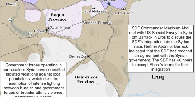 Neither Abdi nor US officials indicated that any progress has been made towards a permanent ceasefire between the SDF and the Syrian government. Barrack said in a statement after his meeting with Abdi that the United States fully supports “advancing the integration process outlined in the January 18 agreement.”[22] The January 18 agreement, which Abdi and Shara both agreed to before Abdi backed out the next day, outlined broad SDF concessions on several of the demands that the SDF has made over the past year, including a clause requiring that the SDF integrates ”on an individual basis” into the Syrian defense and interior ministries.[23] The SDF has long demanded that its fighters integrate as a ”bloc” into the Syrian army, for example.[24] Kurdish media reported that Abdi and Barrack’s meeting resulted in a ”preliminary framework” that integrates Kurdish areas into the Syrian state while retaining some local Kurdish governing authority, citing a participant in the meeting.[25] The parties reportedly discussed integrating SDF fighters into the Syrian army under a ”collective structure” rather than individually, as the January 18 agreement specified.[26] Abdi also spoke with Syrian Foreign Minister Asaad al Shaibani on January 22.[27] The phone call went ”smoothly,” according to two unspecified sources familiar with the negotiations.[28]
