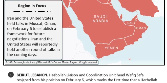 Hezbollah-Lebanese Government Relations: Hezbollah Liaison and Coordination Unit head Wafiq Safa resigned from his position on February 6, which marks the first time that a Hezbollah official of Safa’s rank has stepped down. Safa’s resignation suggests that Hezbollah may be attempting to reduce tensions and improve its relationship with the Lebanese state in order to try to counter US and Israeli pressure on the Lebanese government to disarm and weaken the group.
