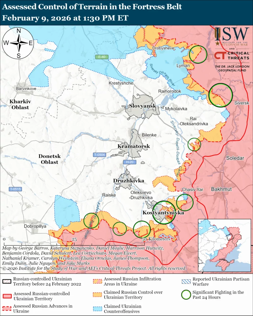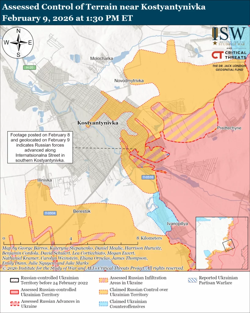 Ukrainian military observer Kostyantyn Mashovets reported on February 9 that the Russian command likely intends to capture the Kostyantynivka-Druzhkivka agglomeration in stages and then advance to the outskirts of Kramatorsk from the east and southeast and has concentrated elements of Russian 8th CAA along the Yablunivka-Illinivka line (southwest and southeast of Kostyantynivka) and elements of the 3rd CAA along the Bila Hora (east of Kostyantynivka)-southeastern Kostyantynivka and the Predtechyne (northwest of Bila Hora)-Kostyantynivka lines.[58] Mashovets reported that Russian forces have not been able to cross the T-0504 Bakhmut-Kostyantynivka highway and are conducting persistent assaults in southern Kostyantynivka, while continuing assaults on the northern and southern flanks of the Kostyantynivka-Druzhkivka agglomeration near Sofiivka and northwest of Chasiv Yar (northeast of Kostyantynivka), attempting to set conditions to encircle the agglomeration and reach the outskirts of Druzhkivka. Mashovets noted that Russian small-group infiltration tactics are spreading out Russian losses over time and have also dramatically slowed down the Russian rate of advance in the area.