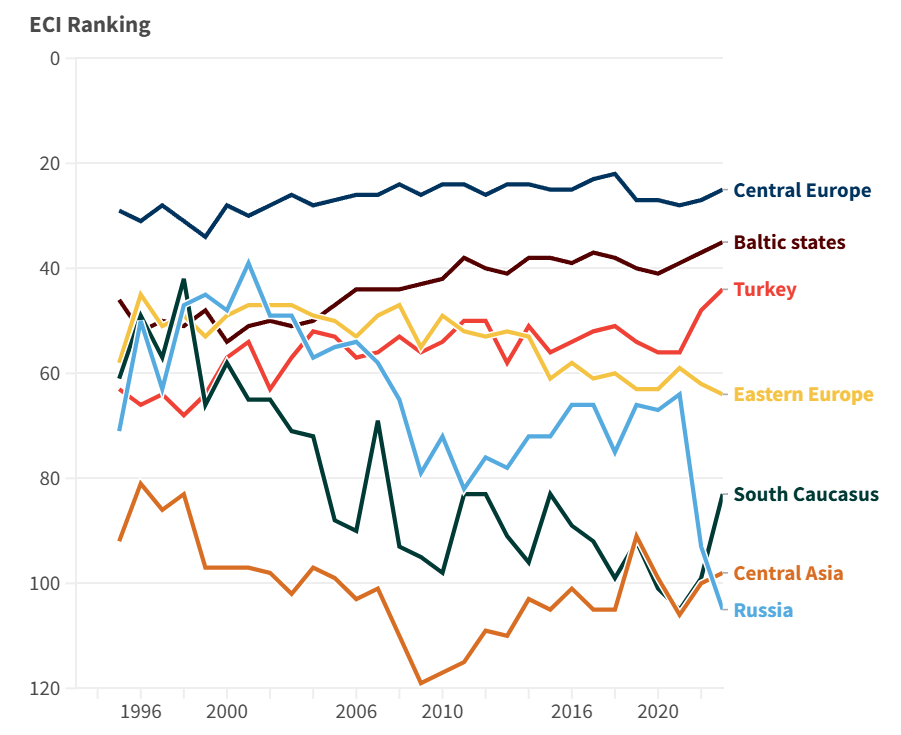 After the collapse of the Soviet Union, the economic trajectories of the South Caucasus and Central Asia diverged sharply from those of former Soviet republics and socialist countries in Central Europe. South Caucasus and Central Asian states experienced marked declines in their levels of economic complexity—a key indicator of productive capacity (see figure 1). Eastern European countries, including Belarus, Moldova, and Ukraine, which did not join the EU, also recorded declines. By contrast, Central European countries—Bulgaria, the Czech Republic, Hungary, Poland, Romania, and Slovakia—and the Baltic states of Estonia, Latvia, and Lithuania, all of which became EU members, managed to preserve (and, in some cases, even increase) their productive capacity.