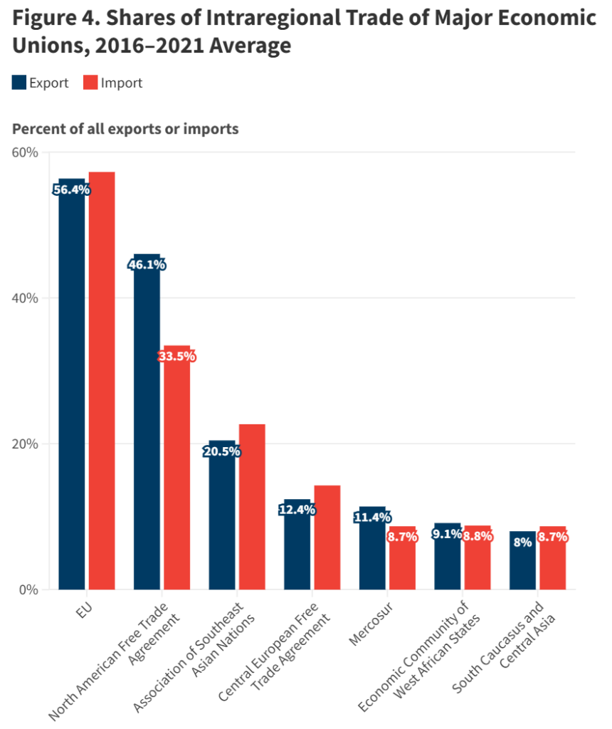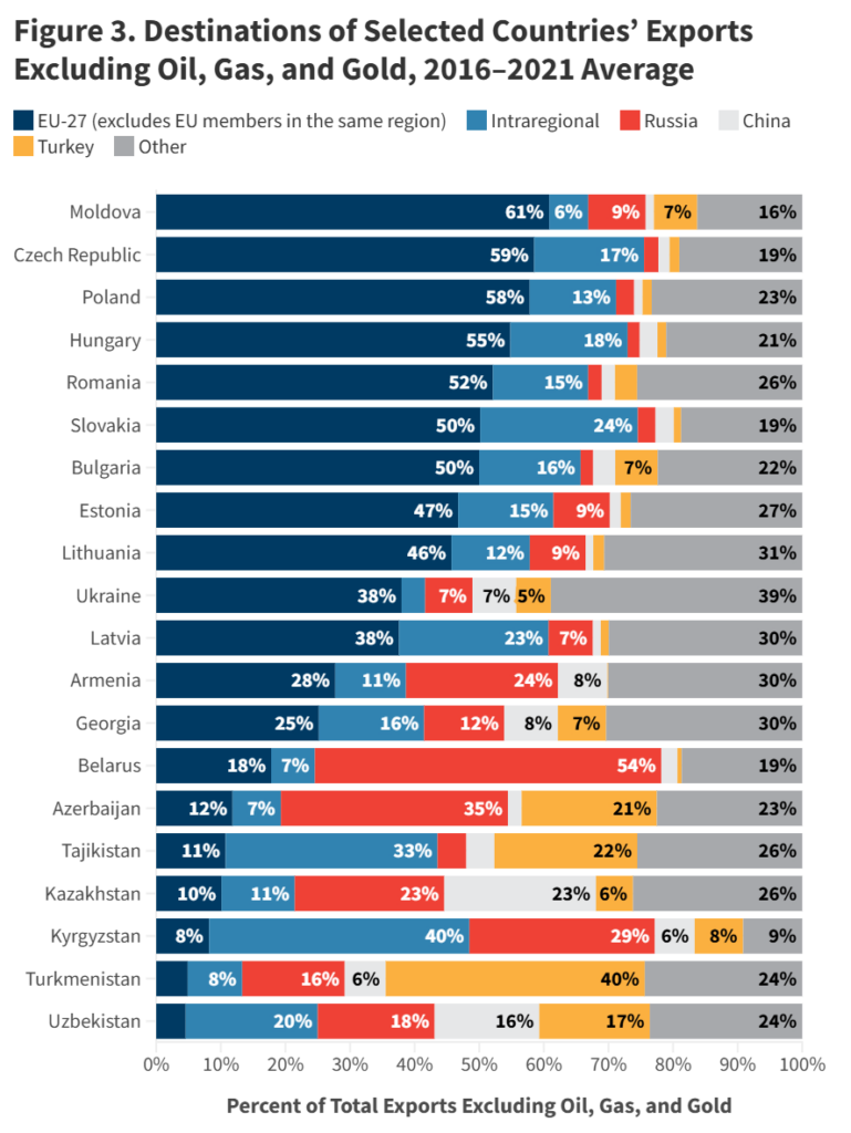 Note: The year 2020 was excluded from the analysis because of trade distortions caused by the COVID-19 pandemic. For the purposes of intraregional trade, countries are classified as belonging to Central Europe, the Baltic states, Eastern Europe, Central Asia, or the South Caucasus. Exports among EU members in the same subregion are classed as intraregional trade; the EU-27 category therefore includes only exports to EU members outside each country’s subregion.