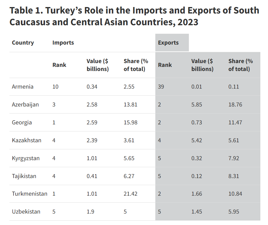Turkey is among the top five trading partners of many countries in the South Caucasus and Central Asia (see table 1). Even Armenia counted Turkey as its tenth-largest import partner in 2023, with imports from Turkey amounting to $341 million—via Georgia, as the land border between Armenia and Turkey is closed. However, the actual volume of Turkish exports to Armenia may be higher, as some are likely reexported as Georgian goods. According to the UN Comtrade database, which provides data on reexports, Georgia’s exports to Armenia totaled $787 million in 2023, of which $621 million were reexports that could include Turkish goods.