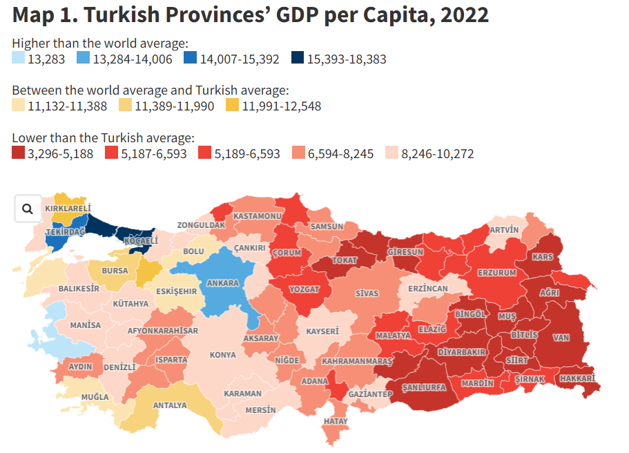 Last but not least, Turkey’s strategic orientation toward the South Caucasus serves a domestic purpose of reducing economic disparities within the country’s borders. Eastern Anatolia, especially the provinces that border Armenia, is one of the least developed parts of Turkey. In 2022, GDP per capita in these provinces was below $6,593—with the level in many provinces under $5,188—compared with the national average of $10,640 (see map 1). The possible opening of Turkey’s border with Armenia—brought about by the new peace environment in the South Caucasus—presents an opportunity to incorporate these lagging provinces into a broader development strategy. Strengthening economic and transportation linkages through Turkey’s eastern provinces would not only improve regional integration but also help revitalize the economy of eastern Turkey.