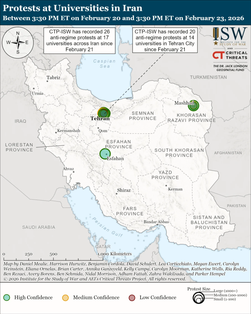Iranians have held at least 32 protests–the majority of which were student-led anti-regime protests–since February 21, which highlights the Iranian population’s continued anger and frustration with the regime for its refusal to address its people’s grievances. CTP-ISW has recorded 26 anti-regime protests at 17 universities across Iran since February 21.[22] Twenty of these protests occurred at 14 universities in Tehran City.[23] CTP-ISW also recorded three instances of clashes between pro- and anti-regime students at three different universities in Tehran City on February 22 and 23.[24] BBC Persian reported on February 23 that the regime has highly securitized university campuses.[25] Iranian media also reported that universities have warned students against protesting amid the 40-day mourning ceremonies.[26] The Iranian regime almost certainly views university students as a threat to the regime, given that university students played a key role in sustaining the 2022-2023 Mahsa Amini protest movement.[27] CTP-ISW observed multiple protests at university campuses in December 2025 and January 2026, but students were not at the forefront of the recent protests.[28]
