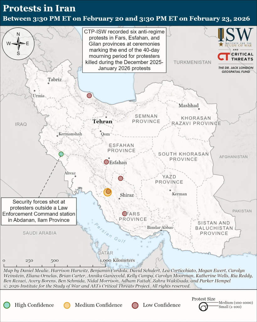 CTP-ISW separately recorded six anti-regime protests in Fars, Esfahan, and Gilan provinces between February 20 and 23.[29] These protests took place at memorials marking the end of the 40-day mourning period for protesters killed by Iranian security forces during the December 2025 and January 2026 protests.[30] Iranian security forces shot at protesters outside a Law Enforcement Command station in Abdanan, Ilam Province.[31]