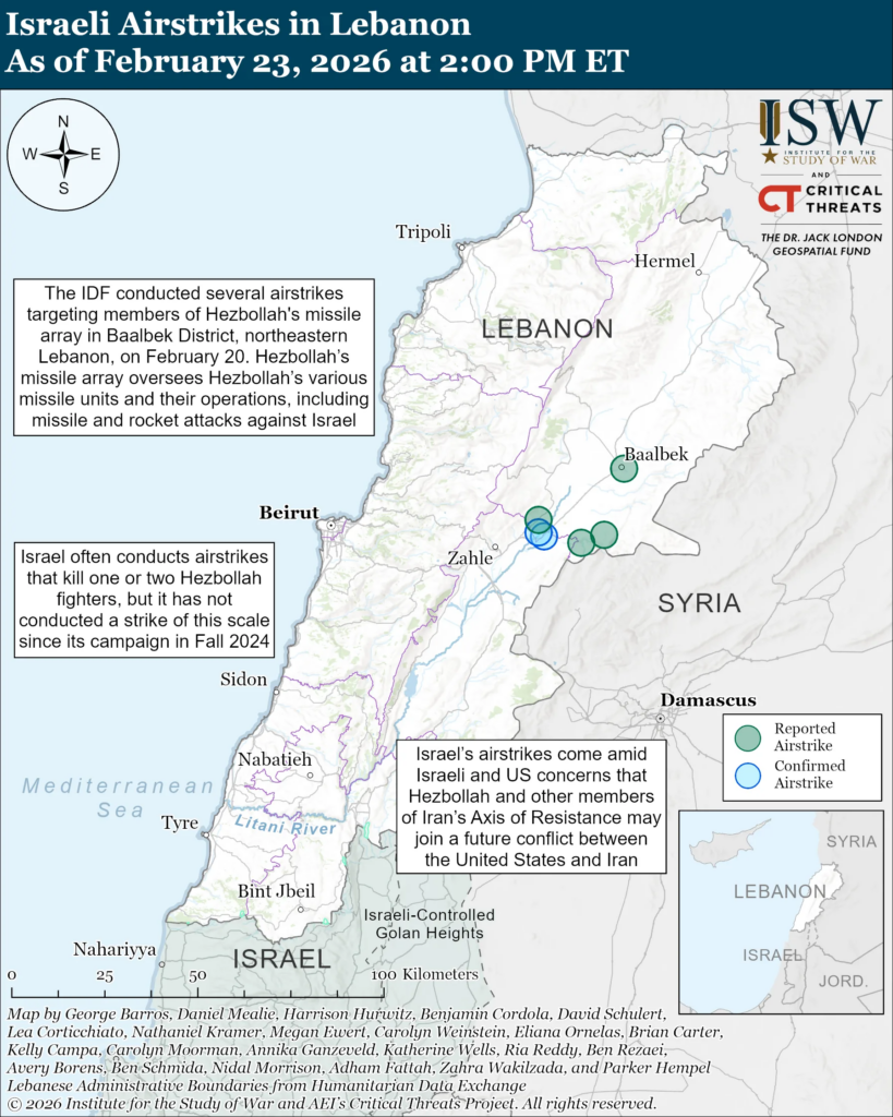 Hezbollah’s Participation in a Future US-Israel-Iran Conflict: The IDF conducted several airstrikes targeting members of Hezbollah’s missile array in Baalbek District, northeastern Lebanon, on February 20. Israel often conducts airstrikes that kill one or two Hezbollah fighters, but it has not conducted a strike of this scale since its campaign in Fall 2024. Israel’s airstrikes come amid Israeli and US concerns that Hezbollah and other members of Iran’s Axis of Resistance may join a future conflict between the United States and Iran.