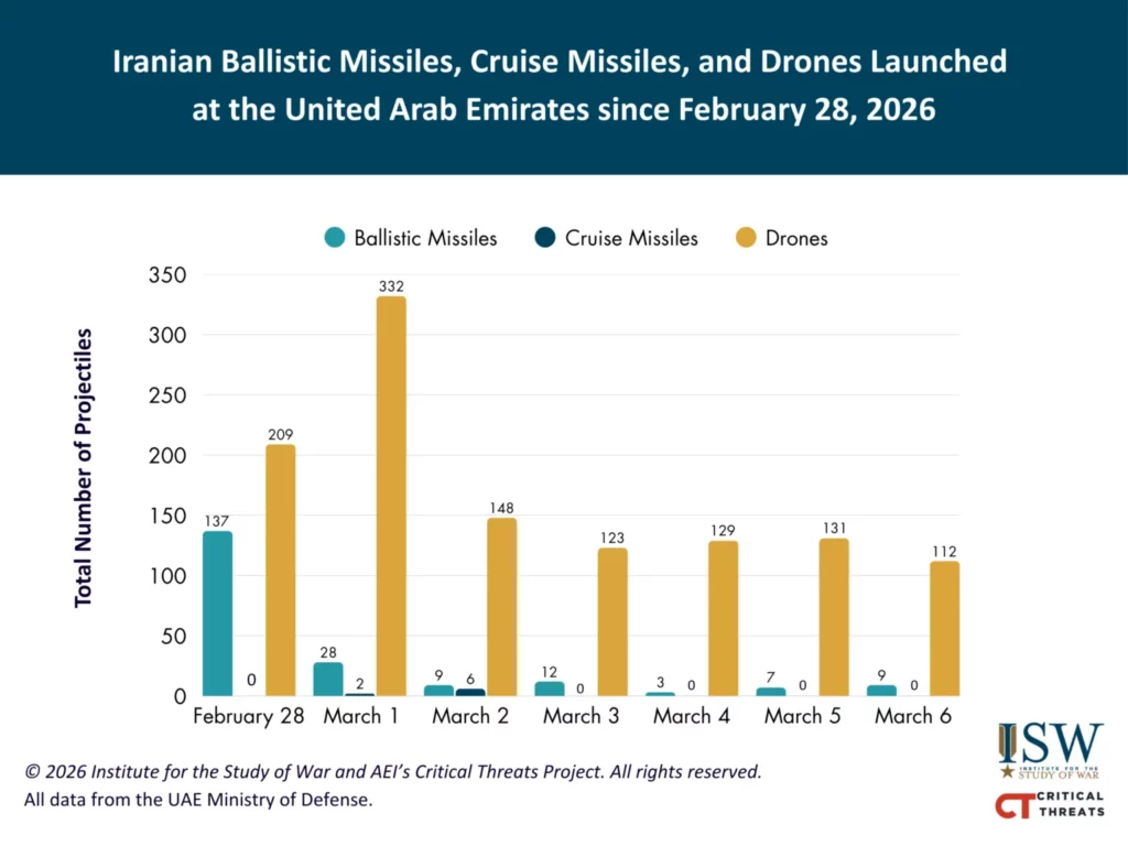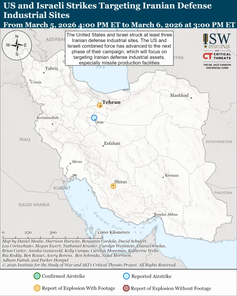 Iran has continued to retaliate against Israel, US bases in the Middle East, Gulf states, and other regional countries for the joint force strike campaign. The Pentagon said on March 5 that Iran has launched over 500 ballistic missiles and 2,000 drones since February 28.[61] Iran has conducted five waves of ballistic missile strikes between March 5 at 4:00 PM ET and March 6 at 4:00 PM ET.[62] This is a decrease in missile attacks as compared to the eight missile waves Iran launched from March 4 at 4:00 PM ET and March 5 at 4:00 PM ET.[63] Iran has launched at least six waves of ballistic missile attacks per day in the previous six days.[64] The lower number of missile attacks further demonstrates the joint forces’ success in degrading Iran’s number of missile launchers. CTP-ISW assessed on March 5 that the joint force advanced to the next phase of its campaign, which will focus on targeting Iranian defense industrial assets, especially missile production facilities.[65]