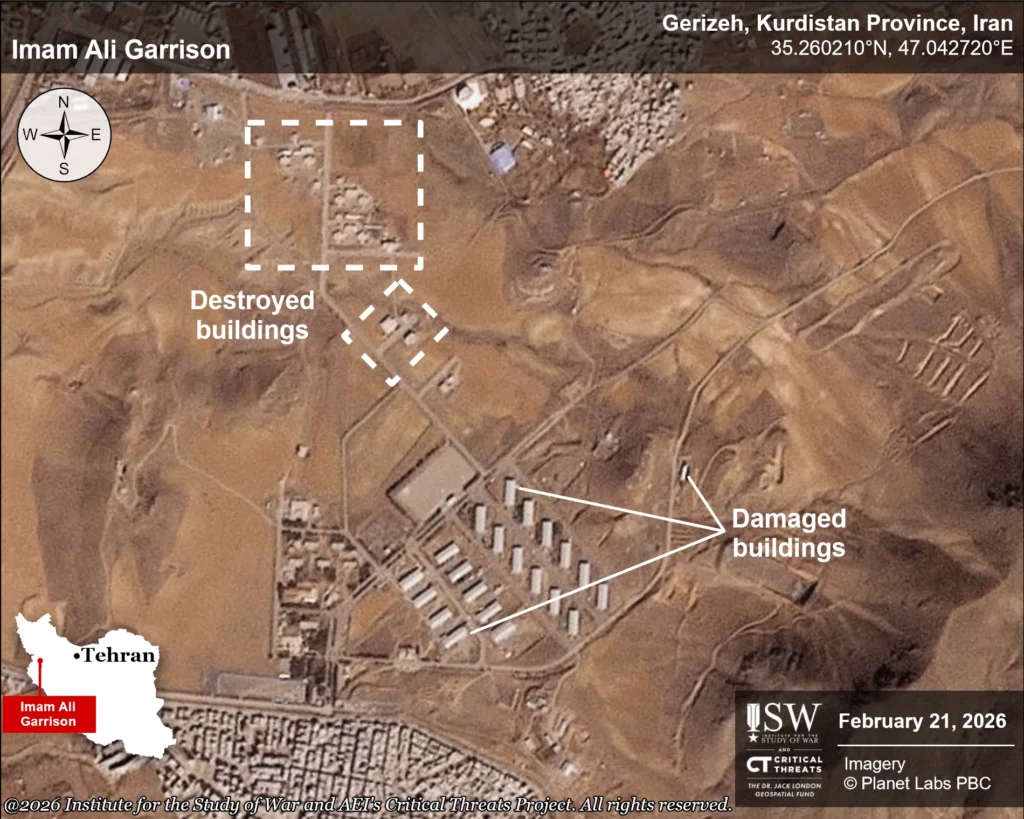 The combined force continued targeting the Iranian internal security infrastructure. The strikes targeted Law Enforcement Command facilities and Basij bases across Iran. These organizations play key roles in suppressing protests and maintaining regime control, and the strikes will likely degrade the regime’s internal security apparatus if the combined force continues to strike these targets at scale throughout the country. The combined force also struck the Islamic Revolutionary Guards Corps (IRGC) Imam Ali Garrison in Sanandaj, Kurdistan Province, on March 5.[37] The garrison hosts the IRGC Beyt ol Moghaddas Provincial Unit and its 22nd Beyt ol Moghaddas Operational Division, which is responsible for internal security and counter-insurgency operations in Kurdistan Province.[38] The 22nd Beyt ol Moghaddas Operational Division falls under the Hamzeh Seyyed ol Shohada Operational Base, one of the IRGC Ground Forces’ regional operational commands headquartered in Urmia, West Azerbaijan Province.[39] The European Union sanctioned the Beyt ol Moghaddas Unit for its role in suppressing protests and committing human rights abuses against demonstrators in Kurdish-populated areas of western Iran.[40] The combined force has also struck other internal security infrastructures in Ilam, Kurdistan, Kermanshah, and West Azerbaijan provinces.[41] These strikes are concentrated in Kurdish-populated areas, where the regime maintains internal security forces to manage unrest and counter Kurdish militant activity.[42]