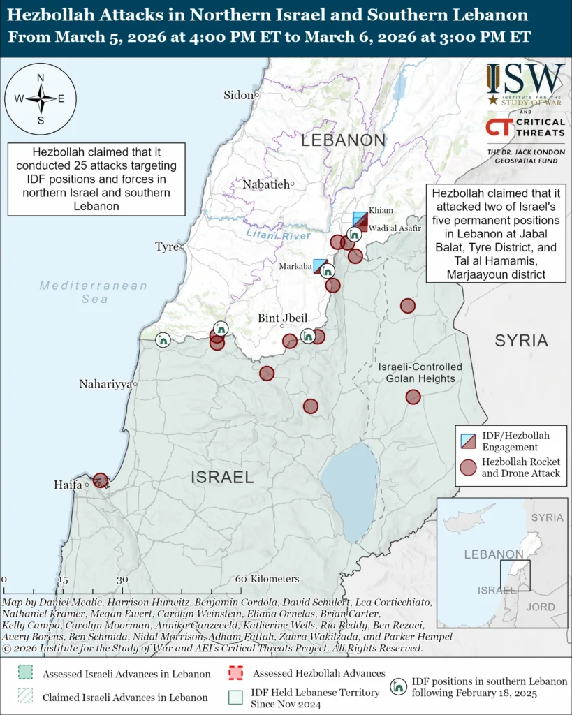 Hezbollah is likely attempting to displace northern Israeli residents from their homes to place political pressure on the Israeli government to curtail its war effort. Hezbollah also released a statement in Hebrew on March 6 calling for northern Israeli residents to evacuate their homes and move five kilometers south of the Israel-Lebanon border.[86] Hezbollah’s attacks after the October 7 War imposed political challenges on the Netanyahu government by forcing the evacuations of northern Israeli residents.[87] Hezbollah’s efforts during the October 7 War were ultimately unsuccessful and led to the Israeli campaign that degraded Hezbollah and returned Israelis to their homes.[88] Israeli Defense Minister Israel Katz said on March 6 that no northern Israeli residents should have to leave their homes or communities.[89] Katz also said that the IDF has reinforced its units operating in Lebanon and has “significantly expanded to additional positions” in Lebanon.[90] Israeli Chief of Staff Lieutenant General Eyal Zamir met with IDF Northern Command commanders on March 6 and discussed reinforcing Israel’s northern border units. Zamir said that the IDF will ”not give up on disarming Hezbollah” in order to protect Israel’s northern communities.[91]