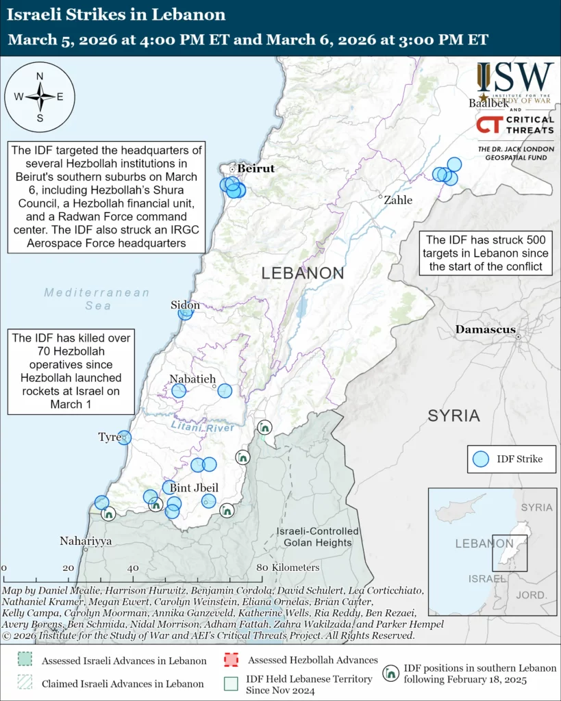 The IDF has continued to conduct airstrikes targeting Hezbollah military sites in Lebanon to degrade Hezbollah’s ability to conduct retaliatory attacks against Israel. IDF reported that it has struck 500 targets in Lebanon since February 28.[92] IDF Spokesperson Brigadier General Effie Defrin said that the IDF has killed over 70 Hezbollah operatives since Hezbollah launched rockets at Israel on March 1.[93] The IDF targeted multiple Hezbollah and IRGC headquarters and military infrastructure in Beirut’s southern suburbs on March 6.[94] The IDF reported that it struck an IRGC Aerospace Force Headquarters and Hezbollah’s Shura Council Headquarters, Unit 7900 Headquarters, a Hezbollah financial unit headquarters, a Radwan Force command center, and a drone storage warehouse.[95] The Shura Council is Hezbollah’s supreme decision-making authority.[96] Unit 7900 is Hezbollah’s naval unit, which is tasked with conducting sea-based attacks against Israel and Israeli targets.[97] The Radwan Force is Hezbollah’s elite special operations unit that Hezbollah, with Iranian support, built to conduct major ground attacks into Israel in the event of war.[98] Hezbollah reportedly ordered its Radwan Force to deploy to southern Lebanon to block Israeli tank advances shortly after Hezbollah launched its first attack against Israel on March 2.[99] International media reported on March 6 that Israeli airstrikes landed near the Iranian Embassy in Beirut.[100] The IDF has not confirmed that it targeted the Iranian embassy at the time of this writing. The IDF also targeted the office of Hamas’ fundraising head, Issam Hashan, in southern Lebanon on March 6, with Shin Bet support.[101] The IDF said that Hashan and Hamas’ fundraising operations have raised ” hundreds of millions of dollars” for Hamas.[102] It is unclear if the IDF killed Hashan in the strike.