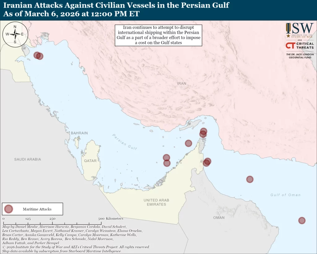 Iran is continuing to attempt to disrupt international shipping within the Persian Gulf as part of a broader effort to impose a cost on the Gulf states. United Kingdom Maritime Trade Operations (UKMTO) reported on March 6 that unknown projectiles struck a tug boat assisting operations on the cargo ship Safeen Prestige, which Iran previously attacked, in the Strait of Hormuz.[57] The UKMTO reported that there are unconfirmed reports of casualties following the likely Iranian drone strike on the vessel.[58] A likely Iranian unmanned surface vessel (USV) struck the Safeen Prestige on March 4, which caused a fire in the engine room and forced the crew to abandon ship.[59] The likely Iranian drone strike on the tugboat is the 13th maritime incident in and around the Strait of Hormuz that the UKMTO has reported since the conflict began on February 28.[60]