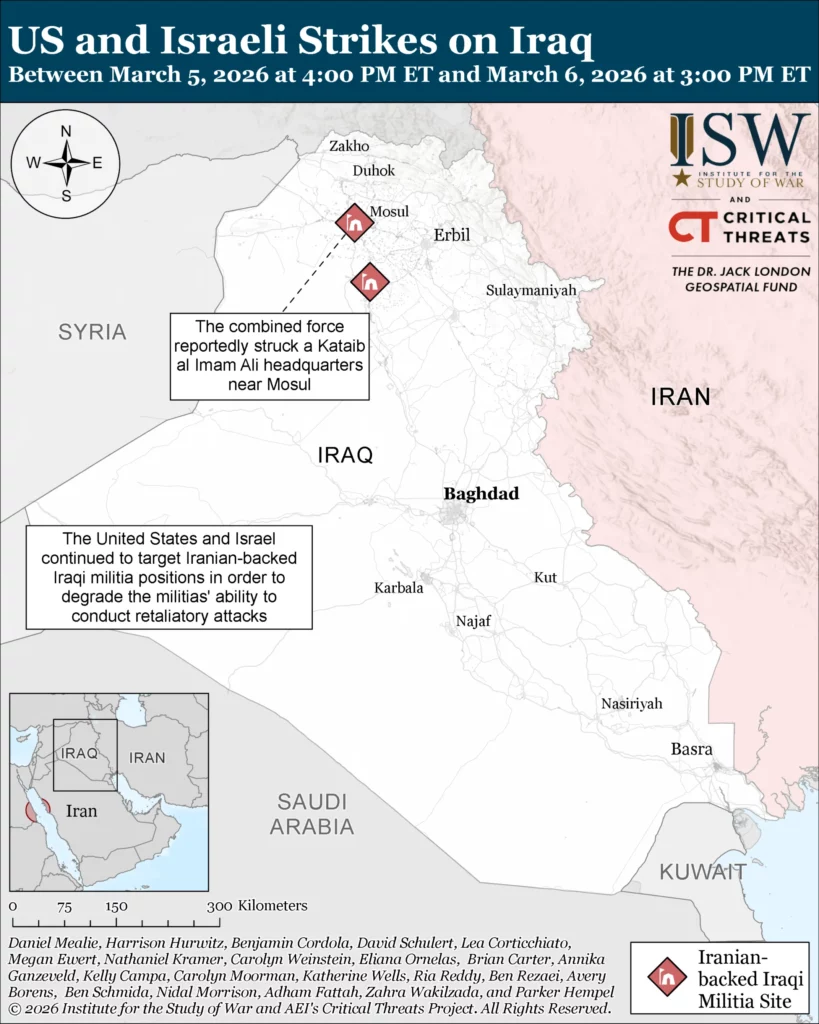 The United States and Israel continue to conduct attacks targeting Iranian-backed Iraqi militia positions in Iraq in order to deter the militias from retaliating against the United States and Israel. A security source in Ninewa Province told Iraqi media on March 6 that a fighter jet struck a Kataib al Imam Ali headquarters south of Mosul.[72] The combined force also reportedly struck an additional Iranian-backed Popular Mobilization Forces site in Ninewa Province on March 6.[73]
