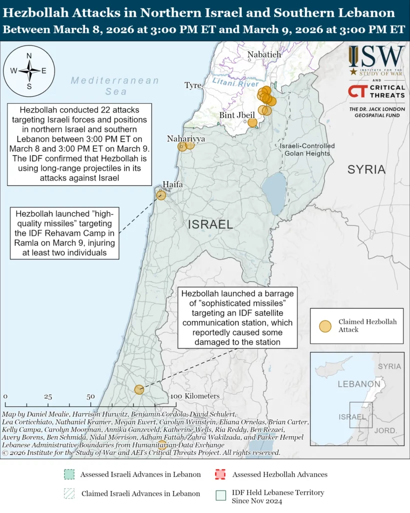 Hezbollah claimed 22 attacks targeting IDF forces and positions in northern Israel and southern Lebanon between 3:00 PM ET on March 8 and 3:00 PM ET on March 9. Hezbollah’s claimed attacks suggest that Hezbollah is increasingly focused on preventing Israeli forces from advancing deeper into southern Lebanon. Hezbollah claimed that it conducted several rocket, mortar, and drone attacks targeting Israeli forces and positions along both sides of the Israel-Lebanon border.[64] Hezbollah claimed two separate attacks targeting the Zeev Air Defense Base in Haifa and the IDF 146th Division Headquarters in Jaatoun, northern Israel.[65] The IDF reported that it intercepted dozens of drones launched from Lebanon.[66]