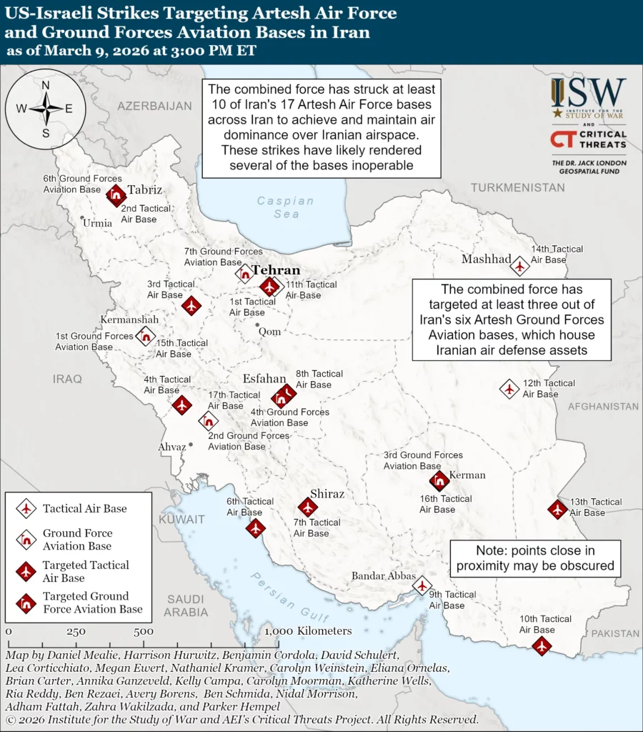 ISW-CTP has recorded combined force airstrikes targeting 10 out of Iran’s 17 Artesh Air Force tactical airbases and three out of Iran’s six Artesh Ground Forces Aviation bases across Iran since February 28 (see map below).[5] The IDF announced on March 9 that the Israeli Air Force (IAF) has targeted six Iranian airbases since the start of the war on February 28.[6] The IDF confirmed on March 8 that IAF airstrikes on March 7 destroyed F-14 fighter jets at an unspecified airbase in Esfahan. These strikes likely took place at the Artesh Air Force 8th Tactical Airbase. Israeli research and education center Alma confirmed on March 9 that the combined force has dropped at least 12 munitions on the Artesh Air Force 8th Tactical Airbase in Esfahan, citing commercially available satellite imagery from March 8.[7] IAF airstrikes previously destroyed 16 aircraft used by the IRGC Quds Force at the Mehrabad Airport in Tehran on March 6.[8] Alma and OSINT analysts separately confirmed damage to two buildings and the runway at the IRGC Aerospace Force Badr Base at Esfahan Airport in southeastern Esfahan City, citing commercially available satellite imagery from March 8.[9] Alma reported that the combined force struck a surface-to-air missile site at the Badr Base earlier in the war, citing commercially available satellite imagery from March 2.[10] Alma noted that Israeli airstrikes in April 2024 destroyed a radar at the Badr Base, likely referring to the destroyed Tomb Stone target engagement radar of one of Iran’s S-300 systems.[11] Another OSINT analyst reported on March 9 that the two damaged buildings at the Badr Base belonged to the Shahed Aviation Industries Production Facility (read more below).[12]