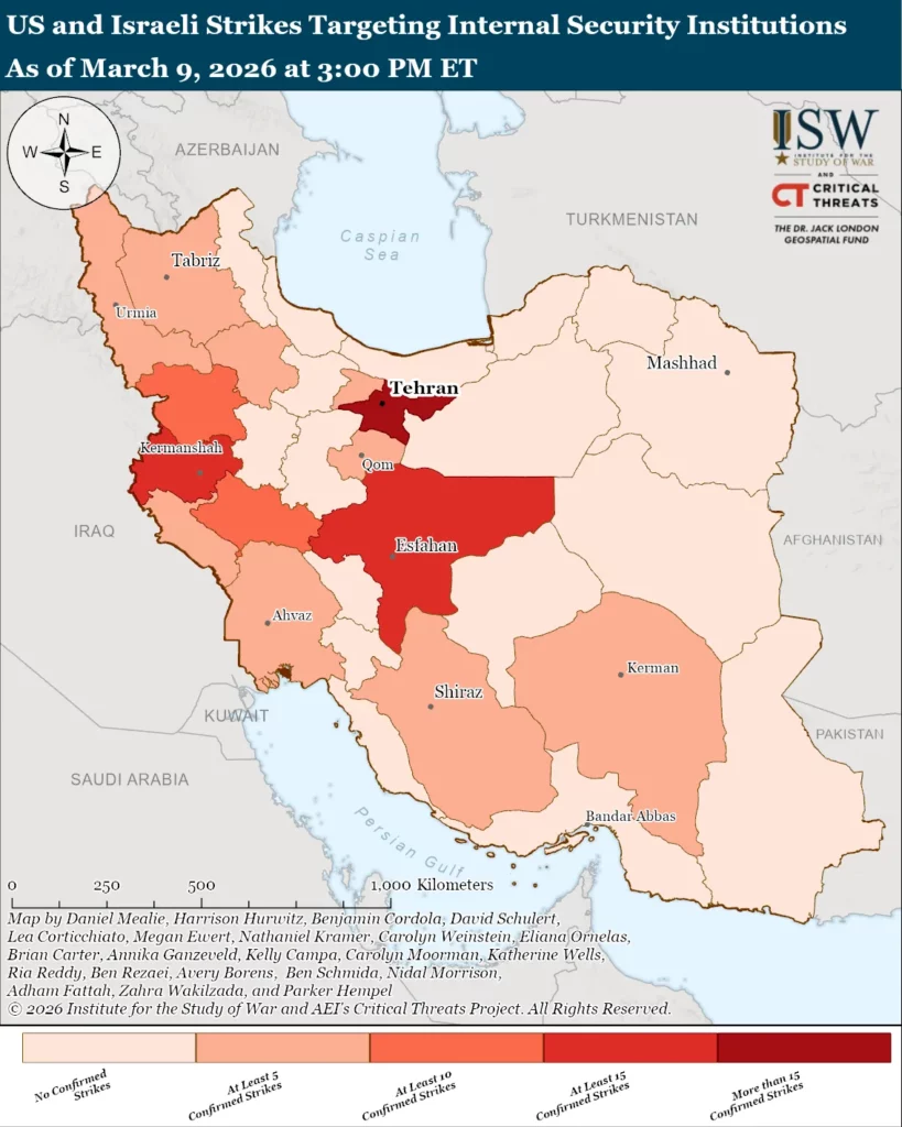 The combined force has degraded Iran’s internal security apparatus in Tehran and parts of western Iran. The combined force has struck dozens of internal security institutions across central and western Iran since February 28.