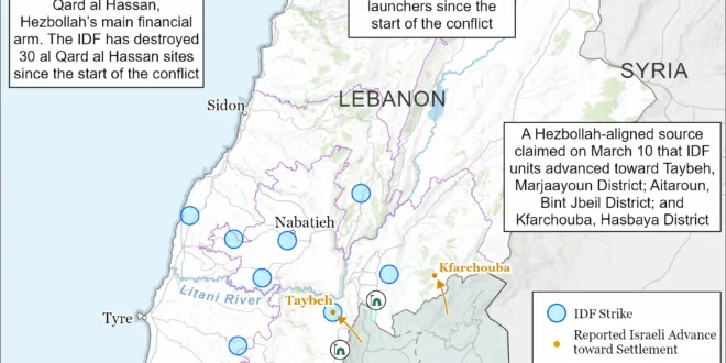 The IDF has continued to conduct airstrikes targeting Hezbollah across Lebanon to degrade Hezbollah’s ability to launch attacks targeting Israeli forces and positions in northern Israel and southern Lebanon. The IDF reported that it has destroyed 70 Hezbollah missile launchers since the start of the conflict.[35] The IDF also targeted at least three locations linked to al Qard al Hassan, Hezbollah’s main financial arm, on March 10.[36] Hezbollah uses funds transferred via al Qard al Hassan to finance its military operations, pay its fighters, and purchase weapons.[37] The IDF has destroyed 30 al Qard al Hassan sites since the start of the conflict.[38] The IDF also targeted a Hezbollah headquarters in Insar, Nabatieh District.[39] The IDF stated that Hezbollah fired rockets from the village targeting Israel on March 9.[40] Israel issued additional evacuations on March 10 for Lebanese residents in Tyre and Sidon in southern Lebanon, as well as in Beirut’s southern suburbs.[41] Israel has issued multiple evacuation notices in southern Lebanon and Beirut’s southern suburbs since the start of the conflict.[42]