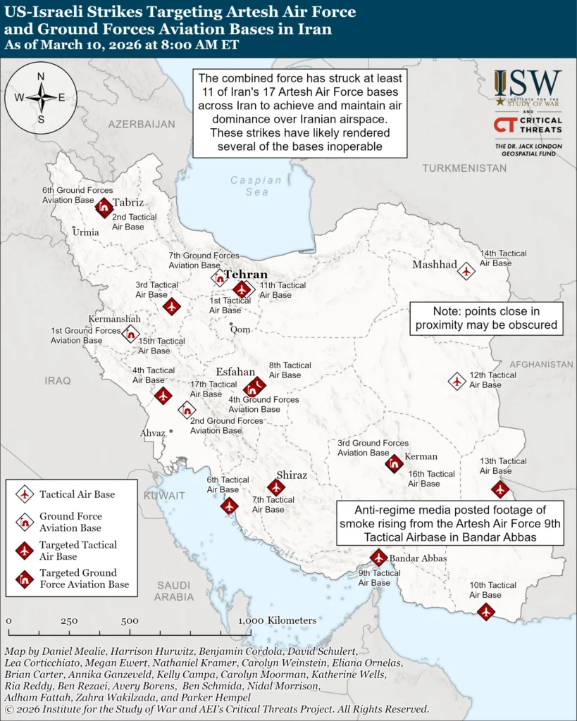 The combined force struck multiple sites in Bandar Abbas, Hormozgan Province, on March 10, which may have included the Artesh Air Force 9th Tactical Airbase. ISW-CTP has recorded combined force airstrikes targeting 11 out of Iran’s 17 Artesh Air Force tactical airbases since February 28.