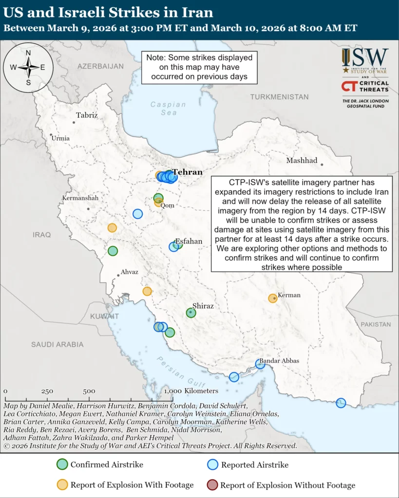 ISW-CTP’s satellite imagery partner has expanded its imagery restrictions to include Iran and will now delay the release of all satellite imagery from the region by 14 days. ISW-CTP will be unable to confirm strikes or assess damage at sites using satellite imagery from this partner for at least 14 days after a strike occurs. We are exploring other options and methods to confirm strikes and will continue to confirm strikes where possible.