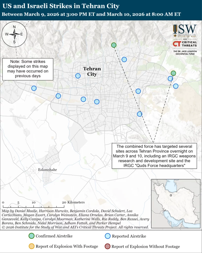 The combined force struck several targets in Tehran overnight on March 9 and 10, including the IRGC “Quds Force headquarters” and an IRGC weapons research and development facility.