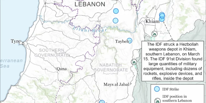 The Israel Defense Forces (IDF) has continued to conduct airstrikes and ground operations targeting Hezbollah in southern Lebanon. The IDF struck a Hezbollah weapons depot in Khiam, southern Lebanon, on March 15.[79] IDF ground forces had previously discovered the depot.[80] The IDF 91st Division previously found large quantities of combat equipment, including dozens of rockets, explosive devices, and rifles, inside the depot.[81] The IDF 401st Armored Brigade (162nd Division) also destroyed a weapons depot and discovered Hezbollah weapons in southern Lebanon on March 16.[82]