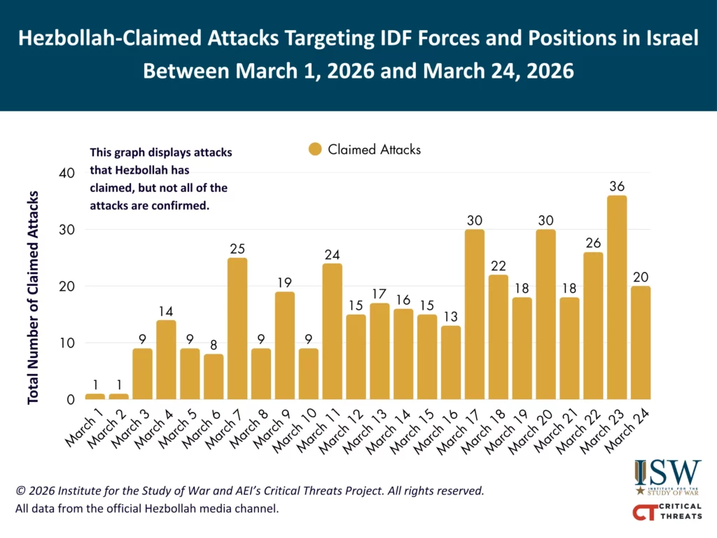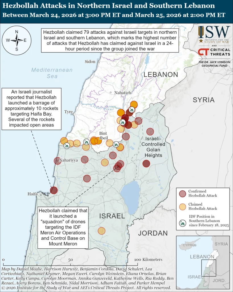 Hezbollah claimed 79 attacks targeting Israeli forces and positions in northern Israel and southern Lebanon, as well as northern Israeli towns, between 3:00 PM ET on March 24 and 3:00 PM ET on March 25.[90] This marks the highest number of attacks against Israeli forces in Israel and southern Lebanon that Hezbollah has claimed in a 24-hour period since the start of the war. Hezbollah claimed that it launched drones and rockets targeting IDF sites in northern Israel, including the Kerem Ben Zimra Logistics Base and the IDF Meron Air Operations and Control Base.[91] Hezbollah also claimed that it conducted 20 rocket, mortar, drone, and anti-tank guided missile attacks targeting Israeli forces and positions in southern Lebanon.[92]