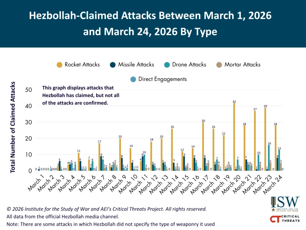Hezbollah has sustained a high rate of drone attacks against Israeli targets since March 22. Hezbollah claimed 21 drone attacks between 3:00 PM ET on March 24 and 3:00 PM ET on March 25, which marks the highest number of drone attacks that Hezbollah has claimed in a 24-hour period since the group joined the war on March 1.[93] Hezbollah previously claimed 14 drone attacks on March 23.[94] An Israeli think tank previously noted that drones are increasingly becoming “a significant component of [Hezbollah’s] campaign.”[95] Hezbollah prioritized domestic drone production and shifted its munition rehabilitation budget to focus on drones after the Fall 2024 conflict.[96] Hezbollah has long assembled low-cost Ayoub and Mersad drones in Lebanon using civilian parts ordered online.[97] ISW-CTP previously forecasted in a February 28 report that Hezbollah would likely use low-cost weapons, such as drones, to conduct attacks against Israel.[98]