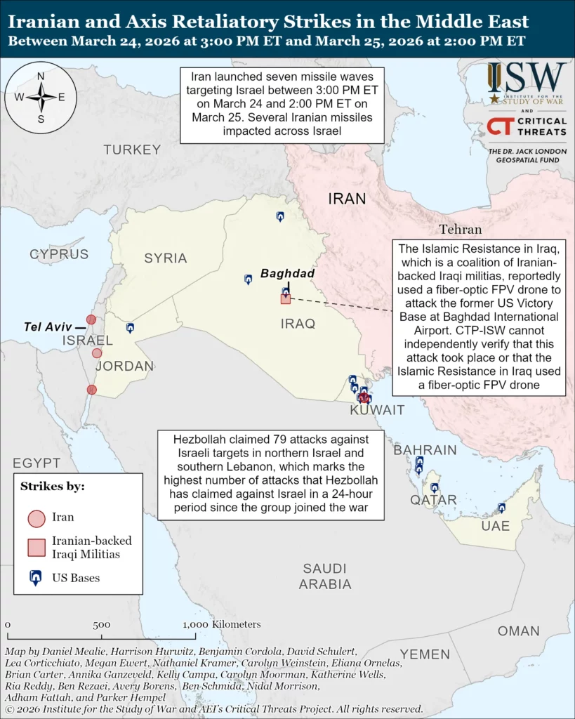 Iran has launched seven waves of missiles targeting Israel since ISW-CTP’s last data cutoff.[79] Six of the seven waves reportedly included only a single missile that the IDF intercepted.[80] An Iranian missile impacted near the Orot Rabin Power Plant in Hadera, Israel, on March 25.[81] The Israeli Electric Corporation stated on March 25 that there was no damage to the plant’s infrastructure.[82] An OSINT account reported that one missile impacted in southern Israel on March 25, injuring at least two people.[83]