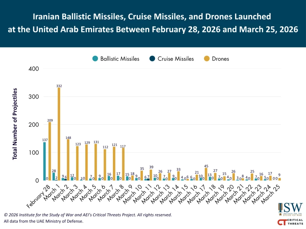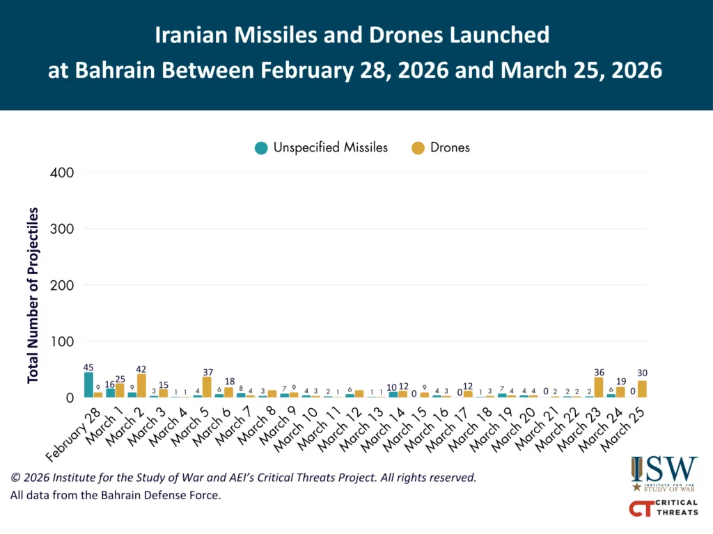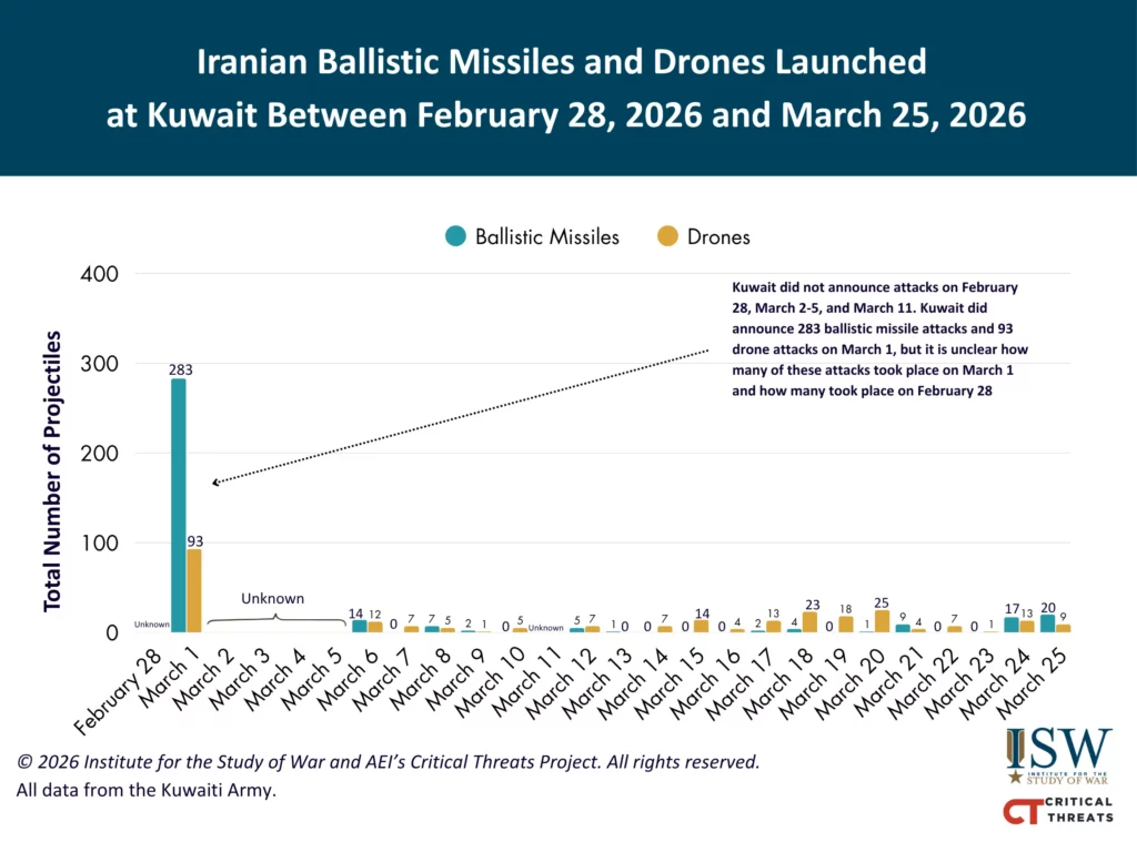 Iran continued to target Saudi Arabia, Bahrain, Kuwait, and the United Arab Emirates (UAE) on March 25. Two unspecified sources told Israeli media on March 22 that Iran had decided to limit its attacks on Saudi Arabia due to concerns that continued strikes could trigger a direct Saudi military response.[84] The rate of Iranian attacks on Saudi Arabia has fluctuated since then, however. Iran launched 7 drones at Saudi Arabia on March 22, 47 drones on March 23, 32 drones on March 24, and 6 drones on March 25.[85] Iran separately fired nine drones and 20 ballistic missiles targeting Kuwait on March 25.[86] One of the Iranian drones struck a fuel tank at the Kuwait International Airport in Kuwait City.[87] Iran launched thirty drones targeting Bahrain on March 25.[88] ISW-CTP previously noted that Iran may be increasing drone attacks against Bahrain to compensate for an apparent pause in drone attacks against Qatar. Iran also launched nine drones targeting the UAE on March 25.[89]