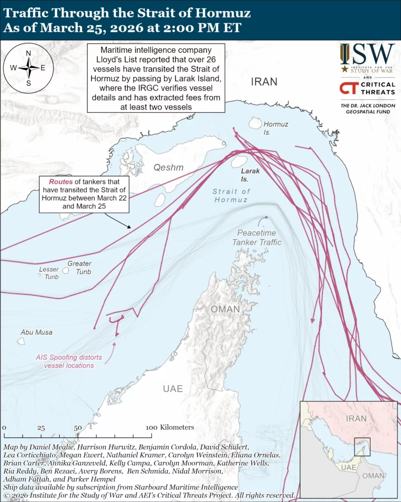 Iran sent a letter to International Maritime Organization member states on March 22 stating that “non-hostile” ships can pass through the Strait of Hormuz if they coordinate with Iran, according to the Financial Times.[21] Ships associated with the United States, Israel, or other “participants in the aggression” are not eligible for safe passage. This report is consistent with reports that at least 26 vessels have taken an Iranian-approved route through the Strait of Hormuz as of March 25.[22] Iran has reportedly required some of these vessels to pay a fee to transit the strait. Maritime intelligence firm Lloyd’s List, citing three sources with direct knowledge of the new system, reported that vessel operators are required to contact intermediaries with connections to the Islamic Revolutionary Guard Corps (IRGC) before transiting through the strait.[23] Lloyd’s List reported that 92 percent of the current traffic in the strait is comprised of Iranian (67 percent), Greek (15 percent), and Chinese (10 percent) vessels.[24]