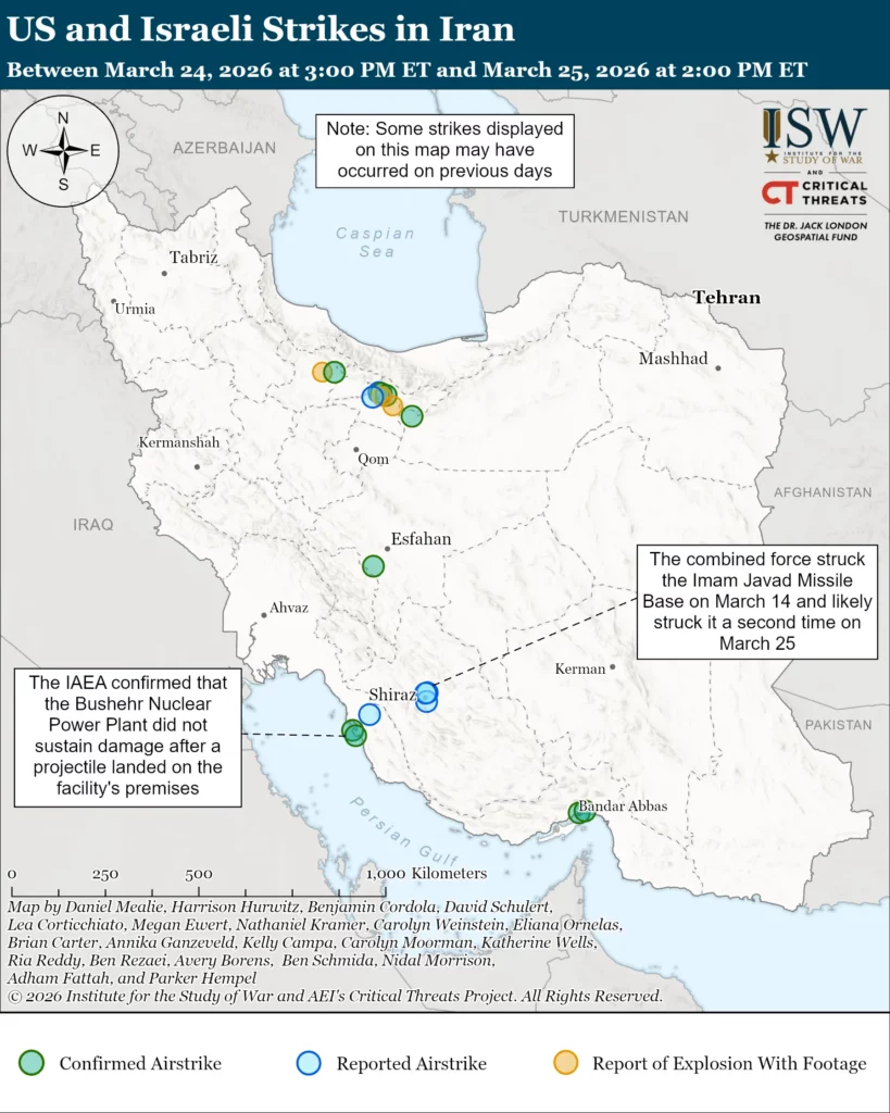 The combined force has continued to degrade Iranian air and air defense capabilities to maintain air dominance over parts of Iran. Multiple OSINT accounts geolocated footage of US Central Command (CENTCOM) strikes on ammunition bunkers at the 9th Artesh Air Force Tactical Airbase in Bandar Abbas, Hormozgan Province, on March 25.[36] CENTCOM footage shows at least four strikes on bunkers at the airbase, followed by a large secondary explosion.[37] The combined force previously struck the 9th Artesh Air Force Tactical Airbase on March 10, March 15, and March 20.[38]