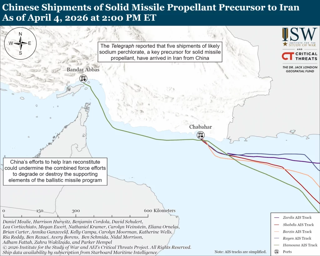 China is helping Iran reconstitute the Iranian missile program amid US-Israeli efforts to degrade it. The Telegraph reported that five shipments of likely sodium perchlorate, a key precursor for solid missile propellant, have arrived in Iran from China.[5] All the vessels are owned by the Islamic Republic of Iran Shipping Line Group (IRISL), which the United States sanctioned in 2021.[6] Four of the vessels are docked or floating near the port in Chabahar, Sistan and Baluchistan Province, and one of the vessels is docked or near Bandar Abbas, Hormozgan Province, according to Starboard Maritime Intelligence. China has previously supplied sodium perchlorate to support Iran’s ballistic missile program.[7] The combined force has targeted several elements of the Iranian ballistic missile program, including missile fuel and solid propellant motor production sites. China’s efforts to help Iran reconstitute could undermine the combined force efforts to degrade or destroy the supporting elements of the ballistic missile program, however.