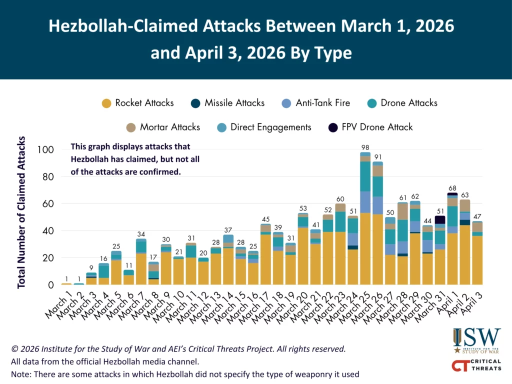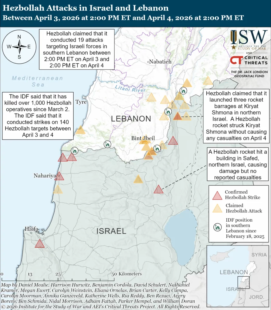 Hezbollah claimed that it conducted 23 attacks targeting IDF infrastructure and Israeli communities in northern Israel between 2:00 PM ET on April 3 and 2:00 PM ET on April 4.[47] Hezbollah claimed it launched three rocket barrages at Kiryat Shmona, northern Israel.[48] An Israeli military correspondent reported that a Hezbollah rocket struck Kiryat Shmona without causing any casualties on April 4.[49] The IDF reported on April 4 that an initial investigation indicated that the early warning system had a ”localized” malfunction that resulted in the warning system failing to issue an alert prior to the Hezbollah rocket impact.[50] Hezbollah claimed it launched two rocket attacks targeting Metula, northern Israel.[51] Hezbollah also launched a rocket attack targeting IDF infrastructure in Safed.[52] Israeli Army Radio confirmed that a Hezbollah rocket hit a building in Safed, northern Israel, causing unspecified damage and no reported casualties.[53]